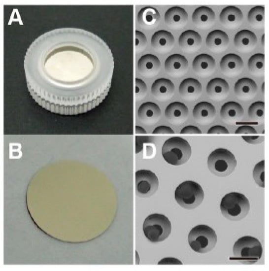 Photographs of the (A) 3-dimensional palladium filter cassette and (B) filter sandwiched by the upper and lower cassette piece. SEM images of the (C) three-dimensional palladium filter and (D) tumor cells trapped in the pockets of the filter. (Reprinted from [42]).