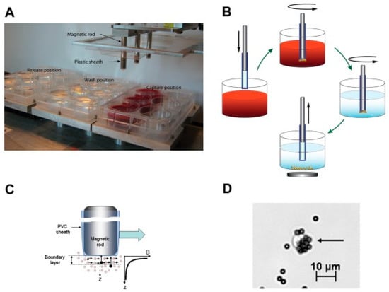 Magnetic sweeper device and cell isolation steps. (A) Magnetic sweeper device showing magnetic rods sheathed in plastic above the capture, wash and release stations. (B) A diagrammatic view of magnetic sweeper cell isolation protocol. (C) A controlled shear force produced by the movement of the magnetic rods in the wash station releases non-specifically bound blood cells. (D) Photomicrograph of a CTC labeled with 4.5 μm immunomagnetic beads. (Reprinted from [44]).