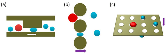 Illustration of the filtering microstructures in microdevices, including (a) weir, (b) pillar, and (c) pore. Red circles represent the CTCs and blue circles indicate the leukocytes, which are relatively small and easily deformed.