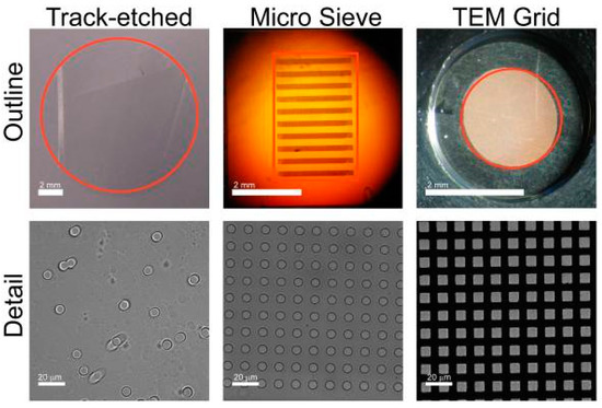 The outline images show a photograph of the track-etch filter, the microsieve and the TEM grid. The perforated area of each filter is indicated in red. The microsieve contains perforated horizontal bars alternated by support bars, giving rise to the horizontal pattern. The detail shows dark field images for the three filters. Spacing of the pores is random for the track-etch filters, leading to occasional double pores. Microsieves and TEM grids have periodical pore spacing. (Reprinted from [56]).