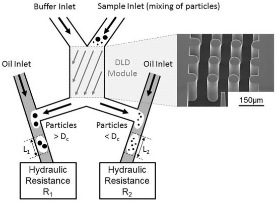 Particles larger than the critical diameter (Dc) were deviated towards the left outlet, while smaller particles flowed in the right outlet. The DLD outlet was connected to a T-junction with an oil inlet, for generation of droplets of lengths L1 and L2. (Reprinted from [58]).