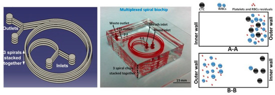 As the mature development of microfluidic technology, precise control of flow stream using complicated microstructures could be achieved to isolate biological cells. Hydrodynamic separation of the cells was demonstrated on the interaction between particles and obstacles [23,58] and inertial effect [25,59,60,61,62,63,64]. For example, crescent-shaped trap arrays with a fixed gap of 5 μm in width were developed to enrich CTCs from whole blood [23]. It is a label-free approach to isolate CTCs based on their distinctively different deformability and size. A capture efficiency of >80% was reported on breast and colon cancer cells. Another example was to use deterministic lateral displacement (DLD) to separate two populations of particles around a specific size [58]. DLD is a size-based fractionation technique. Fluid path of particles in different sizes is oriented by an array of regularly displeased pillars. A platform shown in Figure 8 was developed and consisted of T-junctions connected to the DLD outlets. Particles in different sizes were sorted and encapsulated in droplets. Moreover, a number of studies adopted fluid inertia for biological applications [59,60,61,62,63,64]. Inertial microfluidics works in the intermediate Reynolds number region and was demonstrated on precise fluid manipulation. Due to its high throughput, simplicity, and inexpensiveness, inertial microfluidics is a promising tool for cellular processing. A multiplexed spiral microdevice was developed to enrich CTCs from blood samples [63]. The microdevice is shown in Figure 9. A blood sample and sheath fluid were introduced to the inlets of the microdevice by two syringe pumps. Because of the inertial lift and drag forces, CTCs moved near the inner wall of the microchannel and blood cells went towards the outer wall of the microchannel. Thus, the CTCs could be separated from the blood sample. Moreover, a multistage microfluidic device was developed to separate cancer cells from red blood cell suspension using inertial migration forces [64]. The collection efficiency and enrichment of cancer cells could reach 85% and 120-fold. This microdevice was able to effectively remove red blood cells up to 1% hematocrit condition with a throughput of 565 μL/min. Since hydrodynamic separation is a non-label and high-throughput approach, it is possible for the development of CTC isolation device.