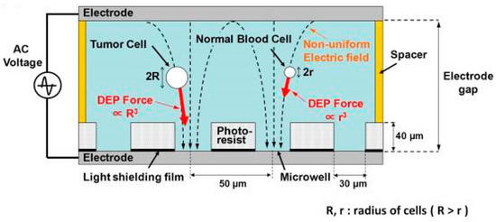 Schematic image of capturing cells using DEP force. (Reprinted from [66]).