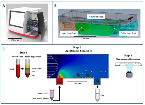 Photography and illustration of the ApoStream® instrument. (A) The ApoStream® prototype instrument. (B) Illustration of the flow chamber showing V-shaped injection and collection ports. (C) Step 1: Sample processing by Ficoll density gradient separation to isolate blood cells and CTCs. Step 2: Dielectrophoresis (DEP) enrichment starting with sample injection, ion diffusion, DEP separation of CTCs from blood cells, and CTC collection. Step 3: Downstream analysis using immunofluorescence or other techniques for CTC identification and enumeration. (Reprint from [69]).
