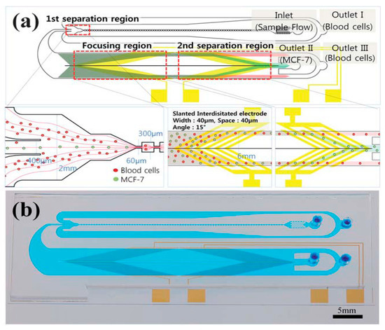 (a) Schematic diagram of the microdevice for cell separation using multi-orifice flow fractionation (MOFF) and DEP. In the first separation region, the relatively larger cancer cells and a few blood cells passed through the center channel and entered the DEP channel, after which most blood cells exited through outlet I. In the focusing region, all cells experienced a positive DEP force and then aligned along both sides of the channel. Finally, the second separation region selectively isolated cancer cells via DEP. (b) Photography of the fabricated microdevice. (Reprinted from [28]).