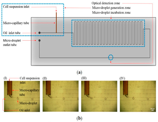 (a) Schematic illustration of the microdevice (top-view layout). (b) Photographs of continuous micro-droplet generation process ((I)-(IV)) (Reprinted from [74]).