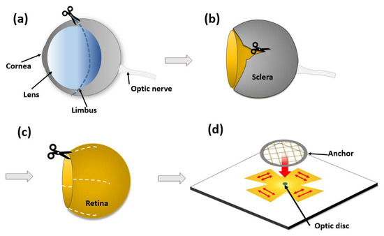 Figure 1. Overview of retinal preparation for ex vivo neural recording on a planar-type microelectrode array (MEA). (a) Cornea and sclera are divided along the limbus. (b) Sclera is cut to isolate the retina. (c) Retina is cut to facilitate flattening. (d) Retina is pressed down by anchor to adhere to the planar-type MEA.
