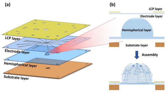 Figure 2. Structure of the hemispherical MEA. (a) Hemispherical MEA consisting of four layers (liquid crystal (LCP) layer, electrode layer, hemispherical layer, substrate layer). (b) Electrode layer is stretched into the shape of the hemispherical layer.