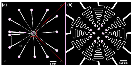 The electrodes are divided into four cardinal directions around the center location, and three electrodes are positioned in each direction. Therefore, a total of 12 channels of recording electrodes and a reference electrode are prepared as shown in Figure 3. The diameter of the recording electrodes is 150 μm, and a circular area with a diameter of 50 μm is exposed from the top PDMS insulation layer to provide an alignment margin between the patterned Pt conductor layer and the upper PDMS insulation layer. The width of the metal line is 30 μm, and the distances from the center to the electrodes are 300 and 500 μm (four electrodes at 300 μm and eight electrodes at 500 μm). The metal lines connected with the electrode sites are designed to have wavy patterns for stretchability and flexibility to allow for deformation into the retina-like hemispherical dome shape [25]. The radius of the wavy pattern is determined to be 150 μm by the equation from the literature, which can provide enough strain to be stretched into the hemispherical shape [26].