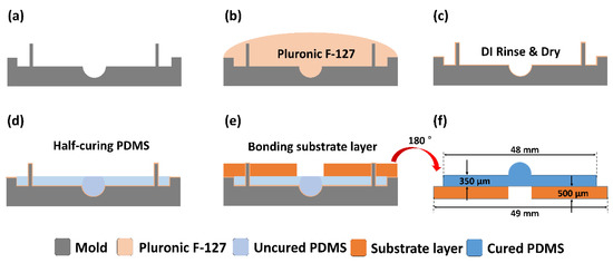 The PDMS hemispherical layer was molded from a stainless mold with a concave spherical shape in the middle as depicted in Figure 4a. Before molding the PDMS (Sylgard 184, Dow-corning, Midland, MI, USA), the mold surface was treated with a 5% nonionic surfactant (Pluronic F-127, Sigma-Aldrich, St. Louis, MO, USA) to facilitate PDMS release from the stainless mold after curing. The mold was soaked in the nonionic surfactant for one hour (Figure 4b), rinsed with deionized water, and dried with nitrogen (Figure 4c). After the surface treatment, 2 mL PDMS solution (Sylgard 184, Dow-corning, MI, USA) was poured to fill the mold. Then, the PDMS solution was degassed in a vacuum chamber and half-cured in a convection oven at 60 °C for 1 h (Figure 4d). After half-curing the PDMS, when the surface became sticky, a substrate layer made of plastic resin was attached to the PDMS hemispherical layer and cured in an oven at 80 °C for 30 min (Figure 4e). After the PDMS was completely cured, the hemispherical and substrate layers were carefully lifted together from the mold. The thicknesses of the hemispherical layer and the substrate layer were 350 μm and 500 μm, respectively. The substrate layer was designed to have a hole (3 mm in diameter) in the center for imaging with an inverted microscope (Figure 4f).