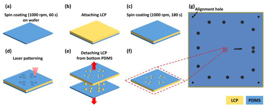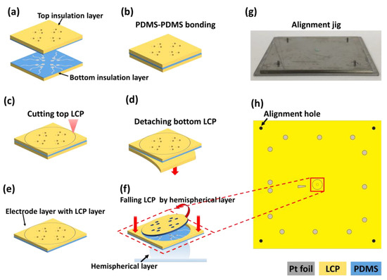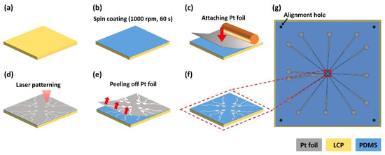 The bottom layer was fabricated on a 4-inch silicon wafer. A 100 μm-thick LCP sheet (LCP, Vecstar CT-25, Kuraray, Japan) was trimmed to a 60 mm × 60 mm square and attached at its edge to the wafer with a commercial scotch tape (crystal clear tape, Scotch®, Saint Paul, MN, USA) (Figure 5a). On the LCP, a degassed PDMS solution was spin-coated at 1000 rpm for 60 s to form a 65-μm-thick PDMS film and cured at 60 °C for 1 h in the oven (Figure 5b). A 12.5 μm-thick Pt foil (Platinum Foil 99.95%, Goodfellow, Huntingdon, England) (50 mm × 50 mm) was attached to the cured PDMS using a hand roller (Φ32 × 50 mm rubber roller, HWA HONG Inc., Hwaseong, South Korea) to prevent bubbles (Figure 5c) [28,29,30]. The outlines of the electrode patterns were cut on the Pt foil using a pico-second laser (LPKF ProtoLaser R4, LPKF Laser & Electronics AG, Garbsen, Germany). The alignment holes were also cut through to the underlying LCP layer with the laser at increased power (Figure 5d). After laser patterning, the background Pt foil was carefully peeled off with forceps resulting in Pt electrodes on the PDMS layer (Figure 5e). After removing the background Pt foil, the bottom LCP layer was separated from the wafer (Figure 5f,g).