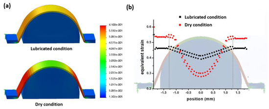 Figure 8. Two-dimensional simulation results for the strain of the stretched electrode layers under lubricated and dry conditions. (a) Strain color map of the electrode layer according to the surface conditions of the hemispherical layer. (b) Equivalent strain plots overlapped with the hemispherical electrode shape.
