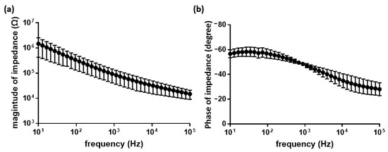 To characterize the electrochemical properties of the fabricated microelectrodes, electrochemical impedance spectroscopy (EIS) was performed on each electrode in the frequency range of 1 Hz to 100 kHz in phosphate-buffered saline (PBS, Gibco, Waltham, MA, USA). The impedance was measured based on a three-electrode system using a potentiostat (ZIVE SP2, ZIVE lab, Seoul, South Korea). An Ag/AgCl electrode and a Pt wire were used as the reference and counter electrodes, respectively.
