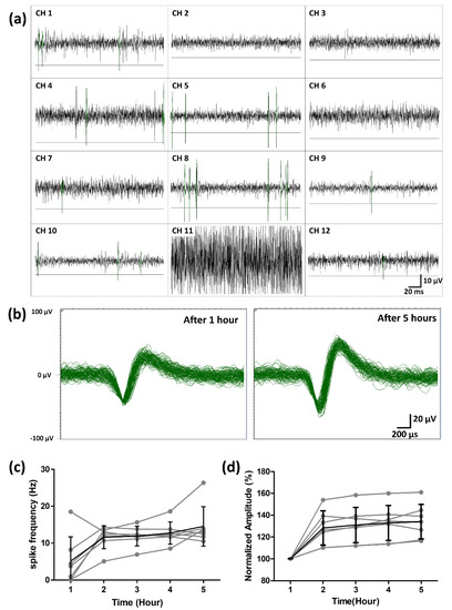 Figure 11. Spontaneous activity from rd1 mice retina recorded using the fabricated hemispherical MEA. (a) Neural signals from rd1 mice were measured in hemispherical MEAs. (The line in each channel is the value of -5 SD of the noise level for signal detection.) (b) The neural signals detected after 1 h (stabilization) and 5 h were overlaid in channel 4. (c) The spike frequency of the rd1 mice retina over five hours (the gray line is the spike frequency detected at each electrode. The black line is the average spike frequency of seven electrodes). (d) The normalized spike amplitude of the rd1 mice retina over five hours (the gray line is the normalized pike amplitude detected at each electrode. The black line is the average amplitude of seven electrodes).