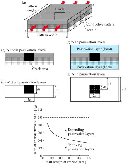 Figure 1a illustrates a conductive pattern with formation of a small crack on a textile. The pattern permeates half the thickness of the textile because it is directly formed on the textile through printing. Figure 1b,c, respectively, illustrate the cross-sectional images of the cracked conductive pattern without and with passivation layers shown in Figure 1a. For simplicity, there is no delamination between each layer, and the mechanical properties and thickness of each layer are identical. In this case, we can regard the cracked conductive patterns without and with passivation layers as finite plates with surface and embedded cracks, respectively. Therefore, the stress intensity factors for mode I (crack opening mode) KI are given by []: