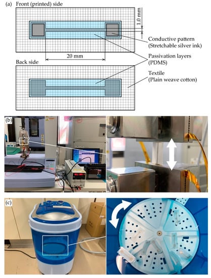 For the measurement of initial resistance, the resistance of the conductive patterns with and without passivation layers were measured with a source meter (2400, Keithley Co. Ltd., Cleveland, OH, USA) using a four-terminal method. Figure 2b,c shows the experimental setups of the cyclic tensile and washing tests. For the cyclic tensile test, a prepared sample was mounted on a tensile testing machine (AGS-X, Shimadzu Co., Kyoto, Japan), and cyclic tensile deformations were applied to it. The elongation rate, number of cycles, and elongation speed rate were 10%, 100 cycles, and 17 mm/min, respectively. During the test, the constant current of 10 mA was applied to the conductive pattern with a constant current power supply (PA36-2B, Texio Technology Co., Kanagawa, Japan), and the voltage between the contact pads of pattern was measured by a data logger (GL900-APS, Graphtec Co., Kanagawa, Japan) using a four-terminal method. The resistance of the conductive pattern was calculated by dividing the measured voltage by the current. For the cyclic washing test, the prepared samples were put into a washing machine (MWM1000, Mitsukin Shoji Co. Ltd., Oita, Japan) and washed with tap water for 9 min. During the washing, the direction of water rotation was regularly changed between right and left. Following the washing, the samples were naturally dried at RT. After drying, the resistance of the conductive pattern was measured with a source meter (2400, Keithley Co. Ltd., Cleveland, OH, USA) using a four-terminal method.