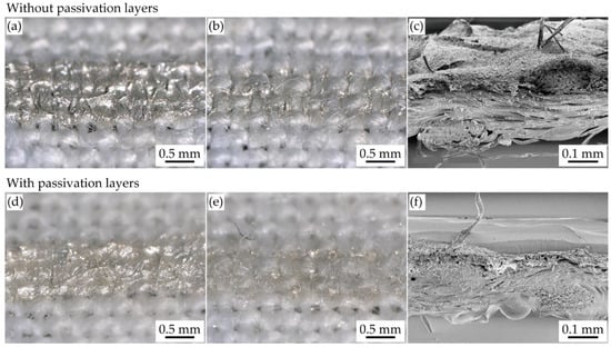 Before measuring the reduction of initial resistance due to the formation of shrinking passivation layers cured at different temperatures, the prepared samples were observed with an optical microscope and scanning electron microscope (SEM) (VHX-D510, Keyence Co., Osaka, Japan), as shown in Figure 3a–f. Figure 3a–f shows the optical and SEM images of a conductive pattern without and with the shrinking passivation layers cured at 120 °C, respectively. Figure 3b,e confirms that the printed stretchable silver ink permeates from the front to the back of the textile in the cases both with and without passivation. The measured conductive pattern width was 1.2 mm, although the designed value was 1.0 mm. This is because of the deep permeation of ink into the textile. The cross-sectional images of the conductive pattern without and with the passivation are shown in Figure 3c,f, respectively. Figure 3f confirms that the conductive pattern is completely covered with the passivation layers, and the effective thicknesses of the conductive pattern, front passivation layer, and back passivation layer are approximately 50, 40, and 50 μm, respectively.