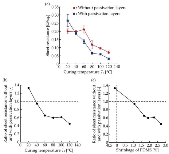 (a) Average sheet resistance of conductive pattern without and with passivation determined by Tc; (b) Ratio of average sheet resistance without and with passivation, determined by Tc; (c) Ratio of average sheet resistance without and with passivation, determined by PDMS shrinkage.