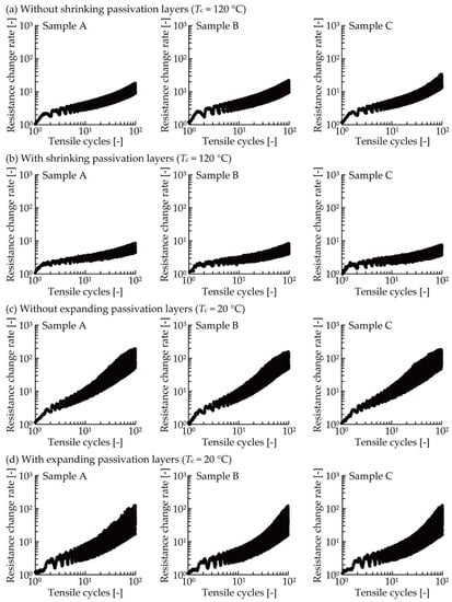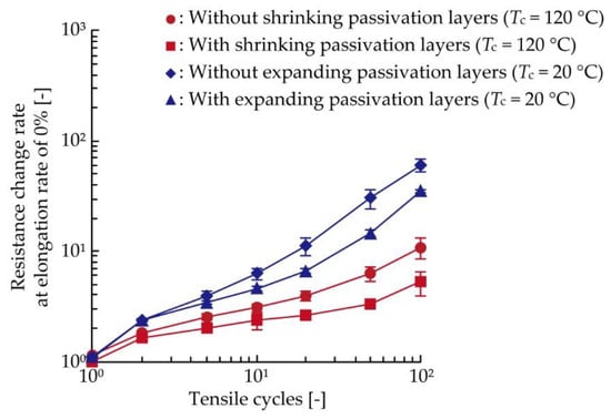 In this test, the change of resistance increase due to deformation caused by the expanding passivation layers was also examined. Figure 5c,d shows the resistance increase due to the cyclic tensile deformation in the case of the conductive pattern without and with the expanding passivation layers cured at 20 °C, respectively. In Figure 5c,d, the resistance change rate also increased as the tensile cycle increased, and the resistance of conductive patterns with the expanding passivation layers shows lower values than those without the passivation. In the numerical comparison, shown in Figure 6, it can be seen that the resistance change rate at 0% during the 100th cycle reduced from 60.3 to 35.2, a 0.58 times reduction, due to the formation of expanding passivation layers. This confirms that the resistance increase due to cyclic tensile deformation was also reduced by the formation of expanding passivation layers under the conditions used in this study.