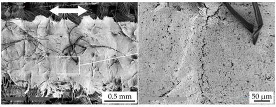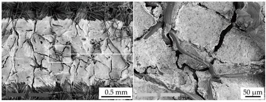 Figure 9 shows SEM images of the conductive pattern without the shrinking passivation layers cured at 120 °C following the cyclic washing test. Figure 9 confirms that the deformation during the cyclic washing test caused the crack propagation in the conductive pattern. The direction of crack propagation was not uniform, and the crack gap was several tens of micrometers; therefore, the resulting cracks were larger than those from the cyclic tensile test, as shown in Figure 7. This indicates that the resistance increase in Figure 8 was caused by the crack propagation, and the deformations applied to the conductive patterns during the cyclic washing test were larger and more complex than those in the cyclic tensile test.