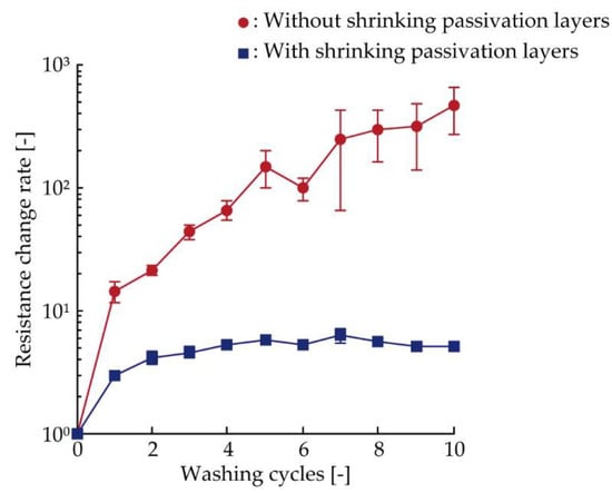 Resistance increase of conductive patterns with and without shrinking passivation layers (Tc = 120 °C) during the cyclic washing test.