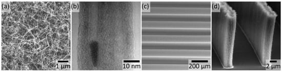 Images of (group one) vertically aligned carbon nanotube (VACNT) forests grown from the Al/Fe catalyst. (a) SEM showing the top-down view of uniform VACNT forests. (b) TEM showing two aligned CNTs from the Al/Fe preparation. The dark contrast vertical lines are the walls of the multi-walled CNT (MWCNT). The dark object encapsulated inside the leftmost nanotube is likely a catalyst nanoparticle. (c) SEM image of (group two) VACNT rows 100 µm in width with 100 µm spacing, imaged at a 30 ° tilt. (d) SEM image of (group three) VACNT rows with a 2.5 µm width, 10 µm spacing, and 20 µm height imaged at an 85° tilt.