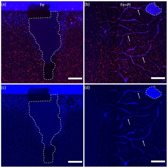 Representative fluorescence images of β-tubulin III labelled neurons (red) and cell nuclei (blue) for the Fe (a) and Fe+Pl (b) preparations showing a large delaminated area on the edge of an Fe sample where no cells can be seen, and both cracks and delamination on an Fe+Pl sample (b,d). (c,d) Images showing only the DAPI staining in the regions depicted in (a) and (b), respectively. The delaminated areas are indicated by the dashed lines and some examples of cracks by the arrows. Scale bars: 500 µm.