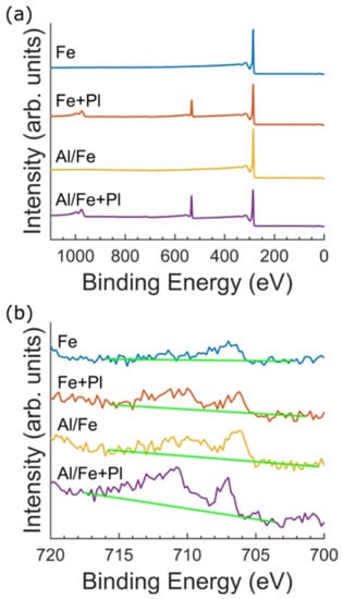 XPS survey scans for all four VACNT preparations. (a) XPS survey scans for the Fe (blue), Fe+Pl (red), Al/Fe (yellow), and Al/Fe+Pl (purple) preparations. All preparations clearly feature the C 1s peak at 284.8 eV. Additionally, the oxygen functionalized preparations feature an O 1s peak near 533 eV. (b) XPS Fe 2p3/2 scans. Background signal is shown for each scan in green. For reference, the binding energy of metallic Fe is 706.7 eV and that of Fe2O3 is 710.8 eV.