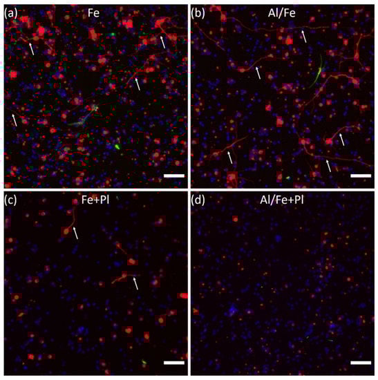 Representative fluorescence images of β-tubulin III labelled (red) neurons and neurites (arrows), GFAP labeled glia (green), and cell nuclei (blue) on all VACNT preparations. (a) Fe, (b) Al/Fe, (c) Fe + Pl, and (d) Al/Fe+Pl showing the occurrence of neurite-bearing cells and the extent of neurite outgrowth in the different preparations. Scale bars: 50 µm.