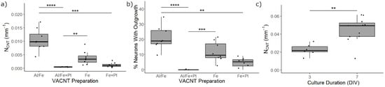 Normalized neurite length was examined as the neuron response variable for the different VACNT preparations. To quantify the neurite length, an automated image analysis algorithm based on one previously reported by Wu et al. was developed []. The developed algorithm allowed us to measure the total neurite length in each FOV, but not the neurite length per neuron. For each sample, the normalized neurite length (NCNT) was calculated by dividing the total neurite length over all FOVs by the available VACNT area. Additionally, the numbers of neurons with and without neurite outgrowth were counted manually for five randomly chosen FOVs per sample (8 samples for each preparation) using the ImageJ Cell Counter plugin. The percentage of neurons bearing a neurite was then calculated for each sample. We tested via Kruskal–Wallis analysis with a post-hoc Dunn’s test against the null hypothesis that the normalized neurite length and percentage of neurons with neurite outgrowth per sample were not dependent on the VACNT preparation for the uniform (group one) samples. For the patterned (group two) samples, the null hypothesis was tested against culture duration instead of CNT preparation. In total, the uniform VACNT samples with 8 per preparation (Fe, Al/Fe, Fe + Pl, and Al/Fe + Pl) were tested across 3 independent 3 DIV cultures, and the patterned samples with 6 at 3 DIV and 11 at 7 DIV were tested across 9 independent cultures.