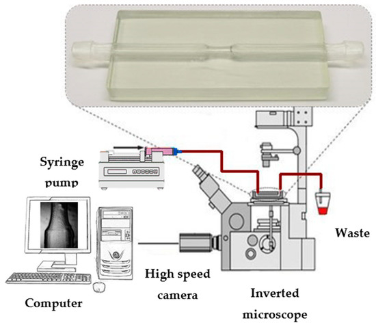 After the fabrication process, in vitro velocity fields of blood flow can be measured using several techniques [18,30,35,36,37,38,39]. However, in the present study, blood flow measurements and visualizations were performed using a high-speed video microscopy system.