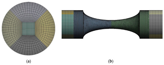 Hybrid mesh generated for the 70% model: (a) inlet view; (b) front view.