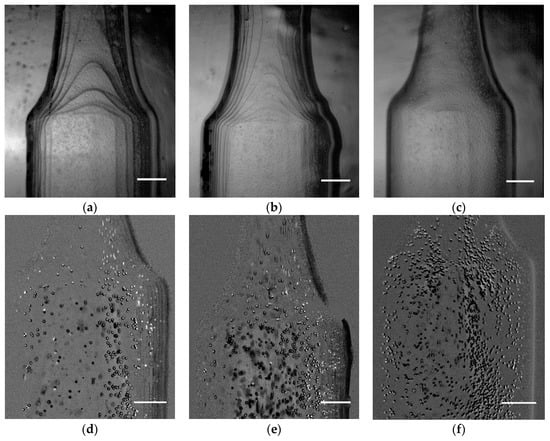 Images obtained for each printing resolution: (a) 150 μm; (b) 100 μm; (c) 50 μm and the respective images with tracer particles obtained by the high-speed camera: (d) 150 μm; (e) 100 μm; (f) 50 μm. Scale bar, 1 mm.