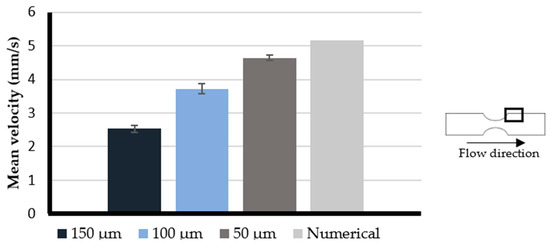 Following the previous results, the effect of the printing resolution in the experimental measurements near the wall was quantitatively evaluated, where the results were most affected by this parameter. For this purpose, the mean particles’ velocity was measured experimentally and numerically near the wall in the post stenotic section of the 50% stenotic model. The experimental measurements were performed at an approximate distance of 100, 105, and 145 µm from the wall. Those distances corresponded to the 50, 100, and 150 µm models, respectively. Numerically, the velocity measurements were obtained from a plane located and with an area close to which the experimental measurements were made. When analyzing the results depicted in Figure 6, the model with values closest to the numerical results is the 50 µm model. The 150 µm model presented the worst results; the velocities measured experimentally were much lower than those predicted numerically. The 100 µm model presented results between the two models mentioned above, but it was significatively better than the 150 µm model.