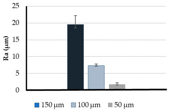 To perform the roughness tests, different cubes were printed with the three different resolutions (three measurements for each case). Figure 7 shows the average Ra values obtained per each resolution proving that this parameter influences the models’ roughness. The higher value was measured in the 150 μm model with an average Ra of approximately 19.53 μm. In turn, the 100 μm model had a significantly lower roughness (7.35 μm). However, the best model was the one printed with the lowest resolution (50 μm), presenting the lowest roughness values with an average Ra of 1.78 μm.