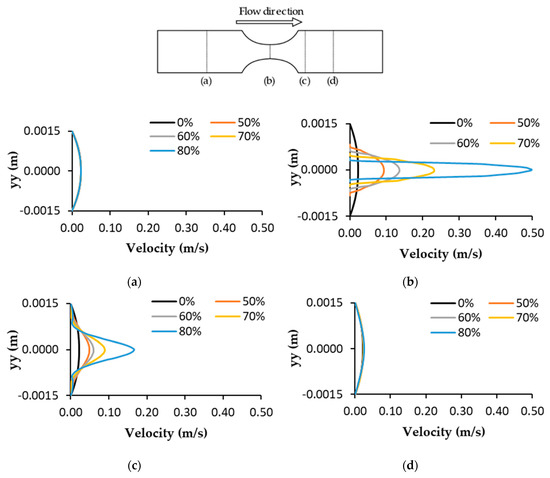 Comparison of velocity profiles at different axial positions for the different degrees of stenosis: (a) before stenosis, (b) stenosis throat, (c,d) after stenosis.