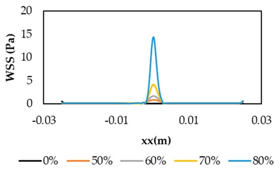 The effect of stenosis on WSS is depicted in Figure 9. The maximum WSS was observed at the throat stenosis and its value increased with the degree of stenosis. This happened because the artery diameter reduction caused higher velocities in the stenosis throat and, consequently, the WSS also increased. Similarly to the previous results, it could be verified that the maximum WSS was reached for a DOS of 80%, being approximately 14.64 Pa. For the healthy model, WSS was almost constant at the value of 0.10 Pa. For the 50%, 60%, and 70% of stenosis, WSS values of 0.86, 1.73, and 4.19 Pa were observed at the throat, respectively. In addition, we noticed that a sudden increase in the WSS from DOS 70% to 80%, showing that the second case was already extreme, possibly leading to acute myocardial infarction.