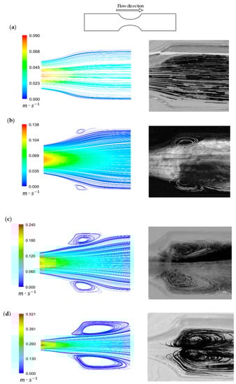 In general, the numerical data showed qualitatively good agreement with the experimental results. In Figure 10a, the numerical data accurately describe the experimental results, showing that with a 50% degree of stenosis, the fluid flows in a laminar and regular way. Looking at Figure 10b, small recirculation regions appeared and both results were in close agreement. However, for this geometry and also in the remaining stenotic cases, the numerical model always predicted smaller recirculation areas. For the 70% stenosis case (Figure 10c), the results were also similar. Additionally, the numerical and experimental recirculation behavior were different when the diameter reduced to 80% (Figure 10d). Although the recirculation length was in good agreement, experimentally the recirculation tended to be formed closer to the stenotic section and around the center of the biomodel, which did not happen numerically.