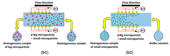Devices employing flow passages with hydraulic diameters smaller than 1 mm are referred to as microfluidic devices [1]. There are several advantages in employing microfluidic devices; these include low sample and reagent requirement, low power consumption, small footprint, and portability. One of the applications for which microfluidic devices are commonly employed is the separation of a heterogeneous sample into multiple homogeneous samples [2,3]; the basis of separation can be either size or type. Separation of a binary heterogeneous mixture into two homogeneous samples based on size requires every microparticle to be acted upon by an actuation force. There are several options for actuation forces that can be employed in microfluidic devices. One of the most commonly used actuation forces is that associated with dielectrophoresis (DEP) [4,5,6,7,8]. DEP is the phenomenon where in dielectric, but polarizable, microparticles suspended in a dielectric medium undergo translation when subjected to an electric field; the electric field needs to be non-uniform for DEP to exist [4,5,6,7,8]. DEP is specifically termed as positive DEP (pDEP) and negative DEP (nDEP) when the translation of the microparticles is towards the highest and lowest gradient of the electric field, respectively [4,5,6,7,8]. The force associated with DEP depends on several factors such as radius of the microparticles, permittivity of the medium, Clausius–Mossotti factor (fCM), and the magnitude and degree of non-uniformity of the electric field [4,5,6,7,8]. The fCM is dependent on the permittivity and conductivity of the microparticle and medium as well as the operating frequency of the electric signal; microparticles experience pDEP and nDEP when real part of Clausius–Mossotti factor, Re(fCM), is positive and negative, respectively. The magnitude and degree of non-uniformity of the electric field depends on the dimensions and shape of the microchannel and the electrodes as well as the electrode configuration. Researchers have proposed electrode configurations for purposes of separation of microparticles based on size [4,5,6,7,8]. This article proposes a microfluidic device (Figure 1) for the separation of microparticles based on size using DEP. The device has one inlet and one outlet and consists of multiple interdigitated transducer (IDT) electrodes located on either sides of the microchannel. The set of electrodes on each side is independently controllable. In this device, separation is achieved by subjecting microparticles of a specific size to pDEP while keeping the microparticles of the alternative size unaffected. The microparticles that are subjected to pDEP will be attracted and captured on the electrodes while the microparticles that are not influenced by DEP will pass through the region of the electrodes unaffected and this leads to separation of microparticles based on size. The microparticles that are unaffected by DEP will be collected at the outlet as the sample is being processed, Figure 1b1; however, the microparticles captured by the electrodes will be collected from the same outlet, by switching off the electric power and flushing the microfluidic device with buffer solution, once the entire sample is processed Figure 1b2. The proposed device has the merit that it can handle high throughput in comparison with most devices proposed in literature [4,5,6,7,8]; this is primarily because the electric field does not decay along the height of the device. The proposed device also has the merit that it does not require focusing prior to separation of the heterogeneous sample. Three-dimensional microfabrication techniques required for realizing the conceptualized device are becoming common as can be observed from several articles in literature [5,9,10,11,12].