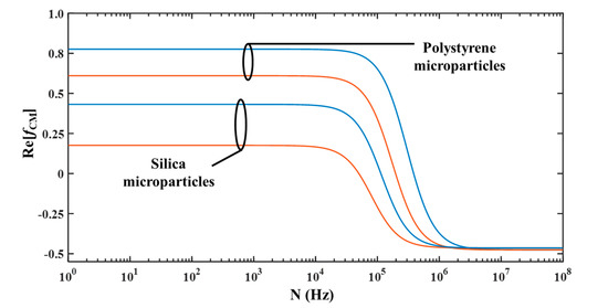 Among all the different parameters influencing DEP force, the polarity of Re(fCM) can be easily altered by varying the operating signal. Thus, the operating frequency of the proposed device should be such that microparticles of a particular size will experience pDEP while microparticles of other size will experience negligible DEP. Figure 2 shows the variation of Re(fCM) with operating frequency for polystyrene (εps = 2.55 and Ks,ps = 2.85 nS) and silica microparticles (εs = 3.8 and Ks,s = 0.82 nS) [13]. It can be noticed that Re(fCM) is dependent on the operating frequency. It can be noticed that for both types of microparticles, irrespective of their radii, the Re(fCM) is positive and negative at low and high operating frequencies, respectively. Furthermore, it can be noticed from Figure 2 that there exists a unique operating frequency, for a mixture of two different sized microparticles, at which the small microparticle experiences pDEP while the big microparticle experiences zero DEP and the proposed device should be operated at this frequency for achieving separation based on size. Frequency at which a microparticle experiences zero DEP force is called cross-over frequency; thus, the proposed device needs to be operated at the cross-over frequency of the big microparticle. Figure 2 has been developed using Equations (1) and (2); cross-over frequency (Ncr) of a microparticle can be calculated using Equation (3).