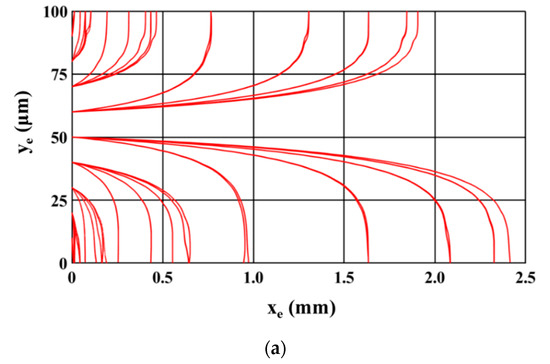 Figure 4. Top view of trajectory of microparticles (a) 2.5 μm and (b) 5 μm (V1 = 20 Vpp, V2 = 12.5 Vpp, Qm = 200 μL/h, l = 120 μm, d = 30 μm, n = 30, N = Ncr,5 = 192.8 kHz).