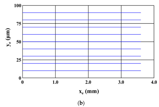 Equation (4) is solved using Finite Difference Method (FDM). For this, the differential terms are replaced by difference terms. The second order differential terms are replaced by second order central difference term. The time step is maintained at 10−5 s. A MATLAB program was developed for solving Equation (4). For solving Equation (4), there are two initial conditions as depicted in Equation (13) and Equation (14). The initial displacements of the microparticle are presented in Equation (13) while the initial velocities of the microparticle are shown in Equation (14). The microparticle can start from any location across from the cross-section of the microchannel and this represents the initial displacement of the microchannel. The initial velocities of the microparticle are same as that of the fluid at the initial location of the microparticle.