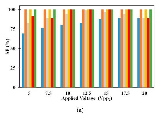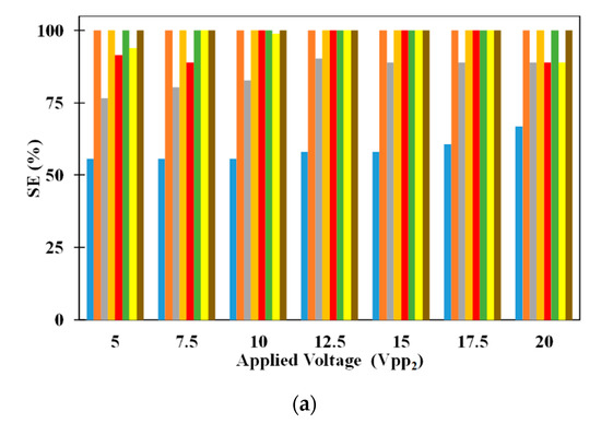 The influence of number of electrodes on the SE of 2.5 μm and 5 μm microparticles is provided in Figure 7a. It can be noticed that increase in the number of electrodes increases the SE of 2.5 μm microparticle irrespective of the applied electric voltages. With the increase in the number of electrodes, the length of the microchannel increases which increases the residence time of the microparticles thereby leading to increase in the SE of 2.5 μm microparticles. It can also be noticed that an increase in applied electric voltage, for a specific number of electrodes, increases the SE of 2.5 μm microparticle. With the increase in applied electric voltages, the pDEP forces attracting the microparticles to the electrodes increase and this is the reason for the observed increase in SE of 2.5 μm microparticle. SE of 2.5 μm microparticle is independent of the number of electrodes when the applied voltages are 20 Vpp. At 20 Vpp, the microparticles in the vertical plane passing through the center of the microchannel experience same pDEP force from both sets of electrodes due to which they remain uncaptured and subsequently the associated SE lower than 100%. At equal applied electric voltages of 20 Vpp, the pDEP force is strong to capture all but those microparticles in the vertical plane through the center of the microchannel and thus, the SE is independent of the number of electrodes. On the other hand, the SE of 5 μm microparticles is independent of the number of electrodes; to achieve separation of the heterogeneous mixture, the 5 μm microparticles just need to remain suspended in the microchannel and this is unaffected by the number of electrodes thereby maintaining the SE of the constant at 100%.