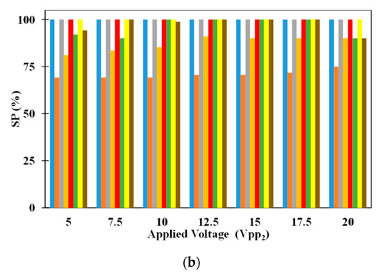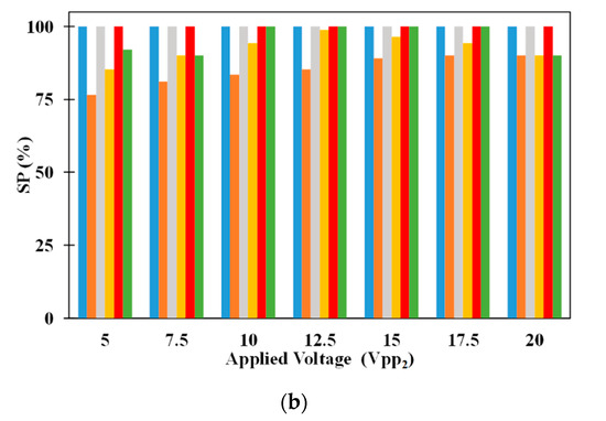 The SP of both 2.5 μm and 5 μm microparticles are shown in Figure 5a as well. It can be noticed that changes in electrode dimensions do not influence the SP of 2.5 μm microparticles for all applied electric voltages. SP of 2.5 μm microparticles is calculated only using the number of 2.5 μm microparticles captured on the electrodes and as these are released for collection after processing of the sample, they appear at the exit without the presence of 5 μm microparticles thereby achieving SP of 100%. On the other hand, SP of 5 μm microparticles is influenced by electrode width and this is related to the number of 2.5 μm microparticles captured on the electrodes. As the number of the 2.5 μm microparticles captured on the electrodes increase due to increase in applied electric voltage or electrode width, the number of 2.5 μm polystyrene microparticles collected along with 5 μm microparticles decreases thereby leading to increase in the SP of the same.