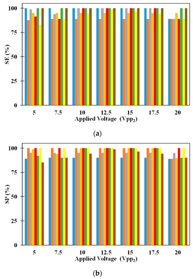 Figure 4 shows the trajectory of the microparticles as the sample is being processed inside the microfluidic device. The sample introduced at the inlet of the microchannel consists of equal numbers of 2.5 μm (radius) and 5 μm (radius) polystyrene microparticles. Figure 4a,b show the path of 2.5 μm and 5 μm microparticles; two different figures are used so that the paths of each size of microparticles are clearly visible. For this study, microparticles of a particular size are uniformly released from the inlet of the microchannel; microparticles are released from 81 locations across the inlet of the microchannel. It can be noticed that all 2.5 μm microparticles are attracted to and captured on the electrodes while the 5 μm polystyrene microparticles travel through the microchannel unaffected. This depicts the ability of the microfluidic device to achieve separation based on size. The following parts of this section details the study carried out to understand the influence of operating and geometric parameters on SE and SP. The operating and geometric parameters considered include applied voltage, electrode dimensions, volumetric flow rate, and number of electrodes.