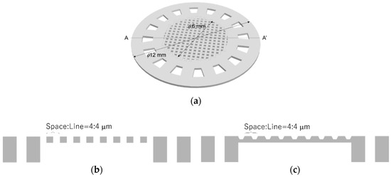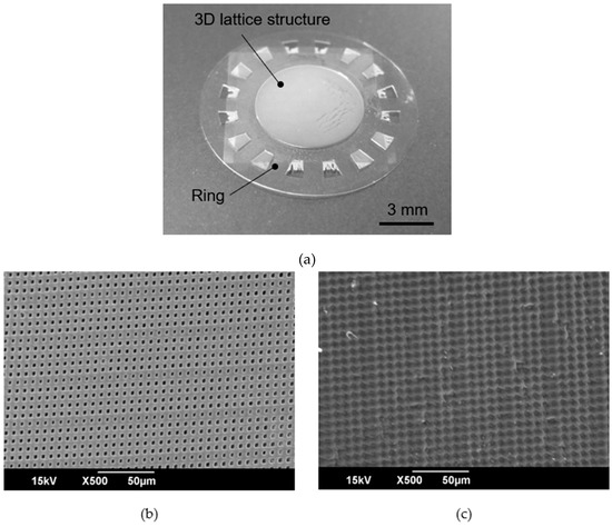 The designed cell culture plate had a 3D lattice structure that was a periodic pattern having pores smaller than cells or a rough surface without pores. The 3D lattice structure was supported by a ring structure. Schematic images of the cell culture plate are shown in Figure 1. The diameter of the cell culture plate was ϕ12 mm. The center of the cell culture plate had a 3D lattice structure with a diameter of ϕ6 mm. The 3D lattice structure consisted of a periodic pattern with a space size of 4 µm and line size of 4 µm. We designed two types of 3D lattice structures: arrayed pores and roughness versus no pores. These two types of 3D lattice structures were fabricated using the same mask pattern. The detailed fabrication process was decided by adjusting the exposure energy.