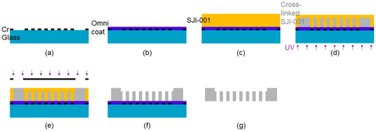 The SJI-001 sample was fabricated by photolithography. First, the glass substrate was cleaned using a piranha solution. SJI-001 was fabricated by mixing 4 vol. % photoinitiator CPI100P (San-Apro, Ltd., Kyoto, Japan) and 96 vol. % epoxy resin, using a planetary stirring machine (Mazerustar, Kurabo Co.). SJI-001 was spin-coated on the glass substrate at 3000 rpm for 30 s. To volatilize the solvent, the SJI-001 layer was baked at 65 °C for 1 h and 95 °C for 3 h. The SJI-001 layer was exposed to the whole surface by exposure light with a wavelength of 365 nm and energy of 3000 mJ/cm2 (PM50C-125A1, Ushio, Inc., Tokyo, Japan). SJI-001 was cross-linked by post-exposure baking (PEB, 65 °C 5 min, 95 °C 5 min). To conduct the same process for fabricating the micropattern, the SJI-001 layer was developed using 1-methoxy-2-propyl acetate(SU-8 Developer, Nippon Kayaku Co., Ltd., Tokyo, Japan) and rinsed with 2-propanol (EL2-propanol, Kanto Chemical Co., Inc., Tokyo, Japan).
