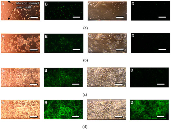 Bright field images and fluorescent images of HeLa cells cultured on SJI-001 and SU-8. HeLa cells were cultured 9 days in PDMS microchannel, the bottom material of which was SJI-001 and SU-8. Bright field images and fluorescence images taken within 2 h after seeding are shown in (a). Bright field images and fluorescence images taken 3, 6, 9 days after seeding are shown in (b–d) respectively. Bright field images and fluorescence images of HeLa cells on SU-8 are shown in A and B, respectively. Bright field images and fluorescence images of HeLa cells on SJI-001 are shown in C and D, respectively. The scale bar is 300 µm.