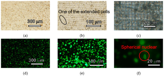Images of HeLa cells cultured 3 days on the cell culture plate. (a) Bright field (×40). (b) Bright field (×100). (c) Bright field (×400). (d) Fluorescent (×40). (e) Fluorescent (×100). (f) Fluorescent (×400).