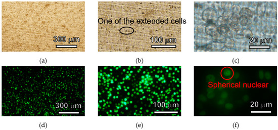 The cell culture plate, fabricated with 1000 mJ/cm2, had a 3D lattice structure with a thickness of less than 50 µm and a millimeter-scale ring structure. In addition, there were no breakages. When a thin structure having a microstructure is released from the substrate, it becomes bent by residual stress [42]. The 3D lattice structure and ring structure of the cell culture plate fabricated by SJI-001 were not bent. The temperature of the bake for removing the solvent for SJI-001 and SU-8 was equal. The baking time for SJI-001 was longer than that of SU-8. The cell culture plate made of SJI-001 was not bent even when the baking time was longer. It is indicated that this characteristic is useful for reducing the residential stress when the large size structure in-plane direction and useful for fabricating a wide-scale structure by a batch process.